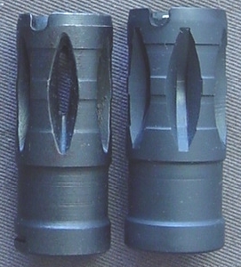 ARS Exclusive. Reproduction fake flash supressor for post-ban rifles. On the left is the original, on the right is the ARS reproduction. Threaded 15mmx1.0 RH. 22.5mm OD. Perfect for your post-ban HK or CETME rifle. Also looks great on post-ban Galils and FALs and can be threaded onto to those 15mm barrels without having to lathe turn the OD as required for 9/16"x24 and 1/2"x28 threads. Retains the appearance of your original, but is legal on post-ban guns. Carbon steel, military grade manganese phosphate coating ("Parkerized") $25 +$5 s/h/i